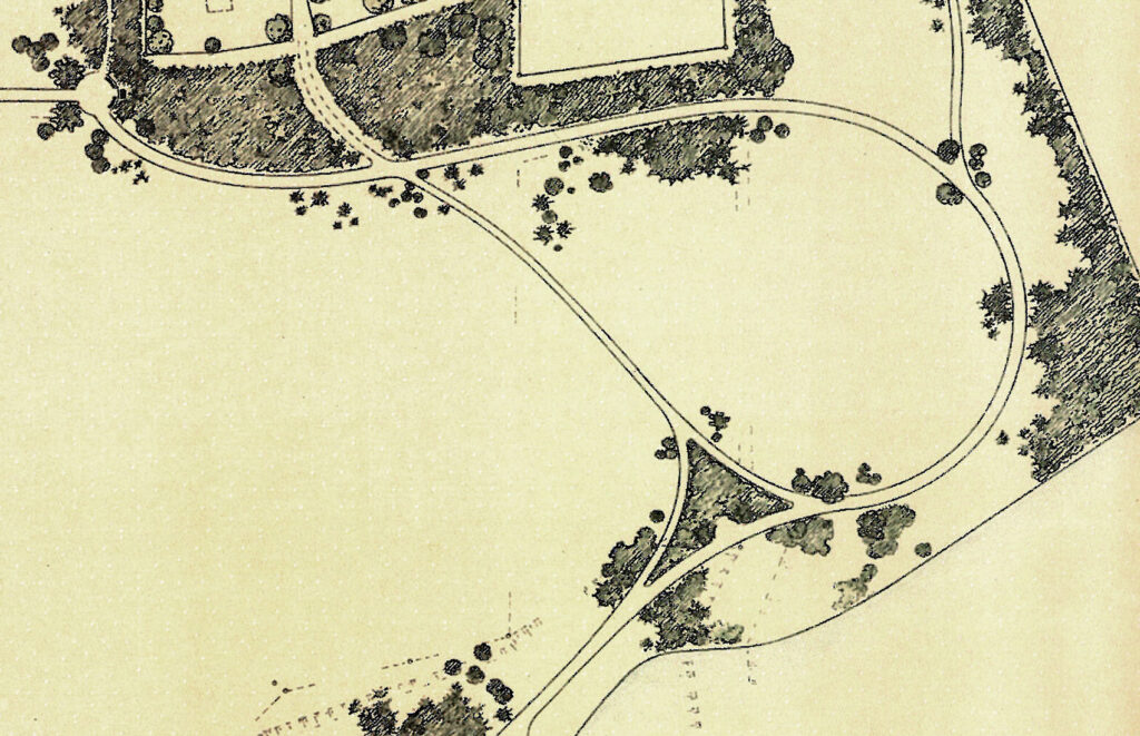 Ein Ausschnitt aus Plan von 1930, den die Gebrüder Mertens im Auftrag der Baronin erstellt haben: Er zeigt den Rundweg an, der hinter dem 2018 eröffneten Spielplatz durchführt (Quelle: Familienarchiv).